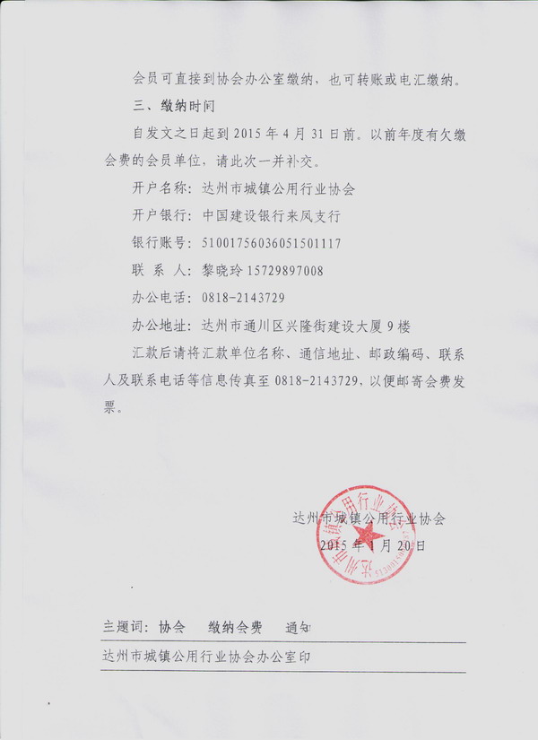 達州市城鎮(zhèn)公用行業(yè)協(xié)會關于繳納2015年度會費的通知