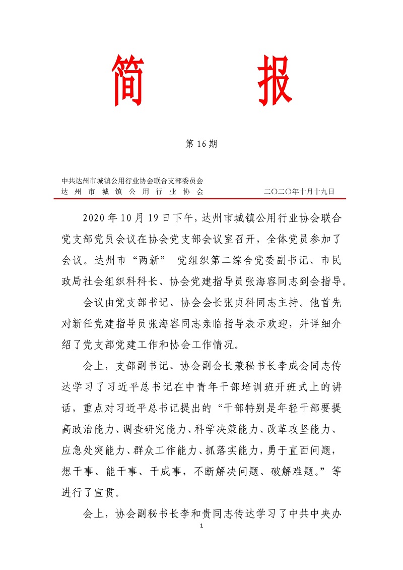 中共達(dá)州市城鎮(zhèn)公用行業(yè)協(xié)會聯(lián)合支部委員會2020年第十六期簡報(bào)
