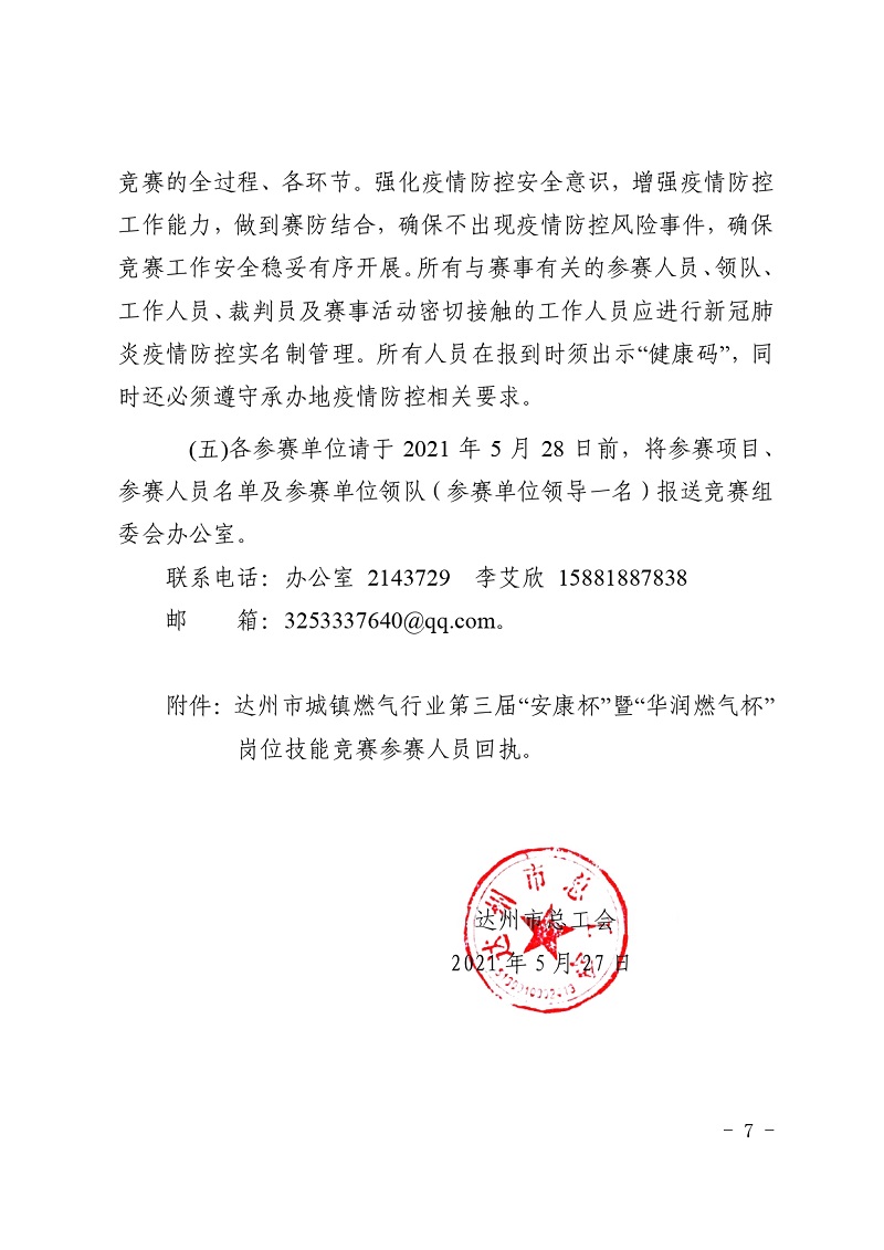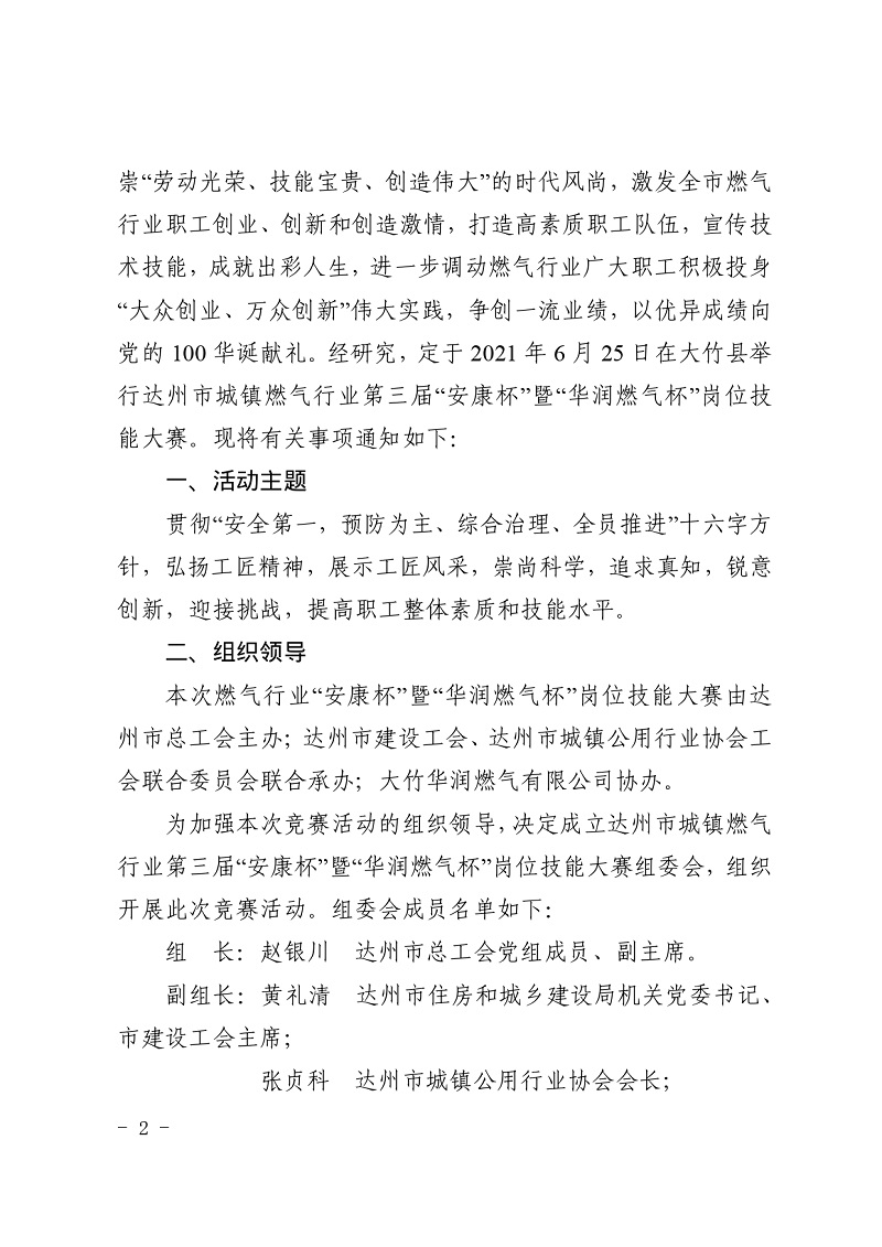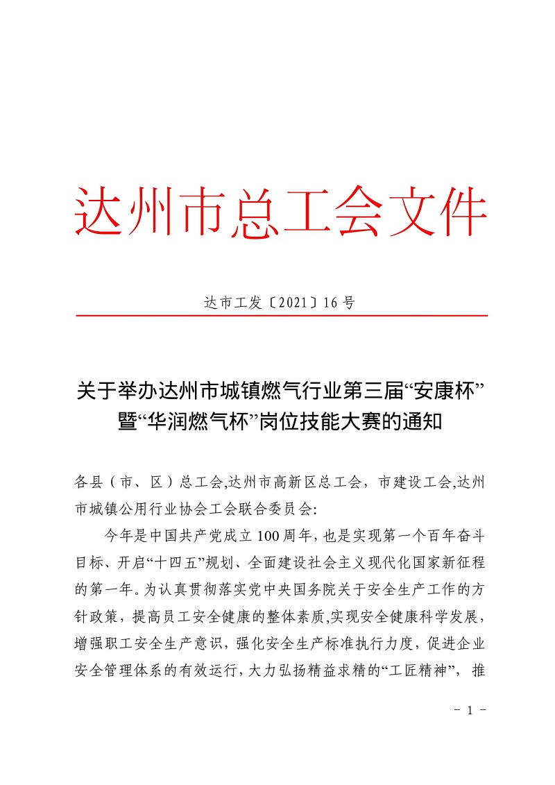 達(dá)州市總工會(huì)關(guān)于開展達(dá)州市城鎮(zhèn)燃?xì)庑袠I(yè)第三屆“安康杯”暨“華潤燃?xì)獗睄徫患寄艽筚惖耐ㄖ?