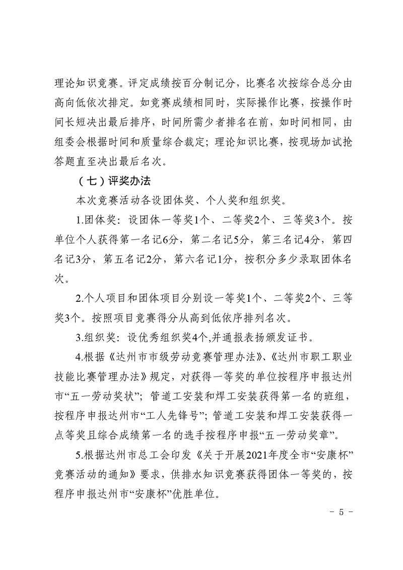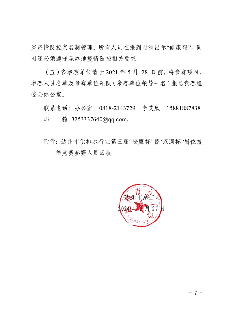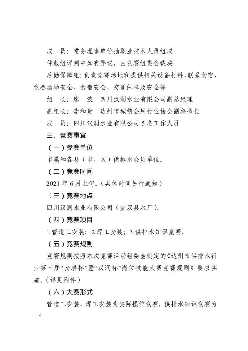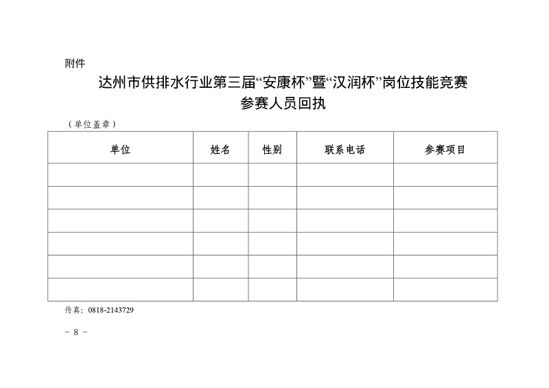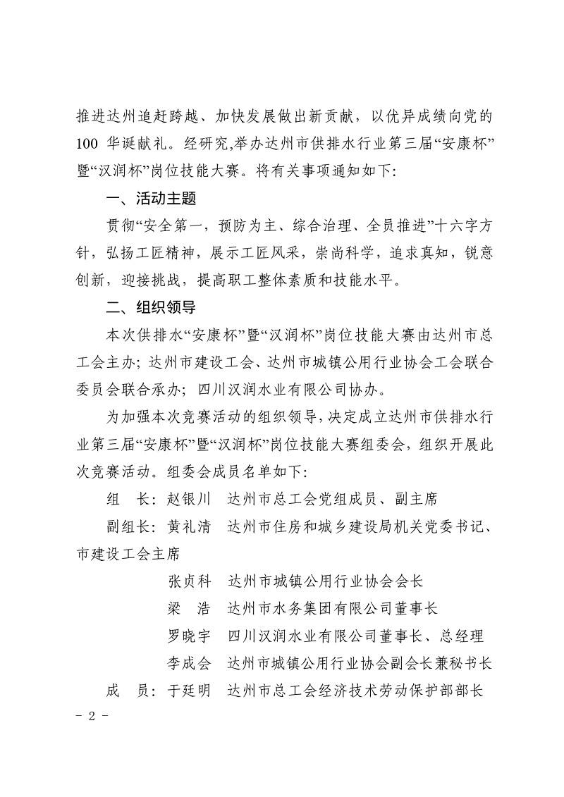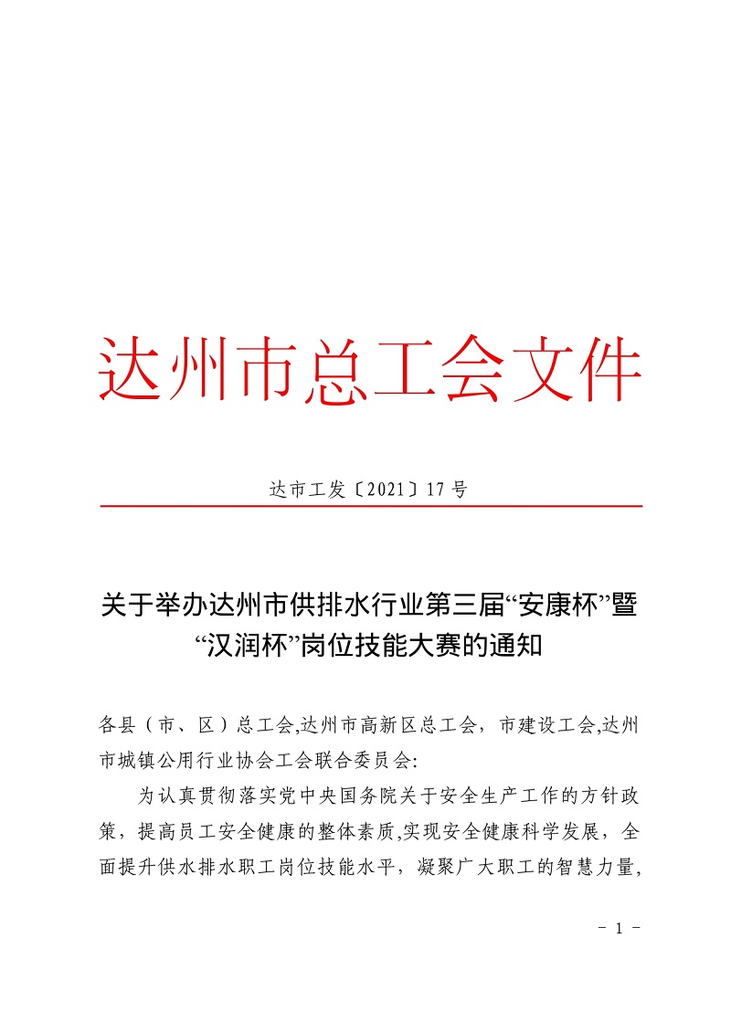 達(dá)州市總工會(huì)關(guān)于開展達(dá)州市供排水行業(yè)第三屆“安康杯”暨“漢潤(rùn)杯”崗位技能大賽的通知