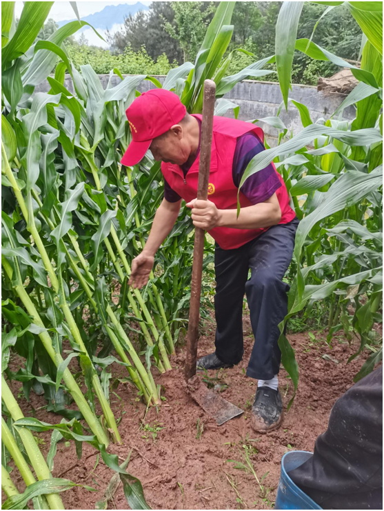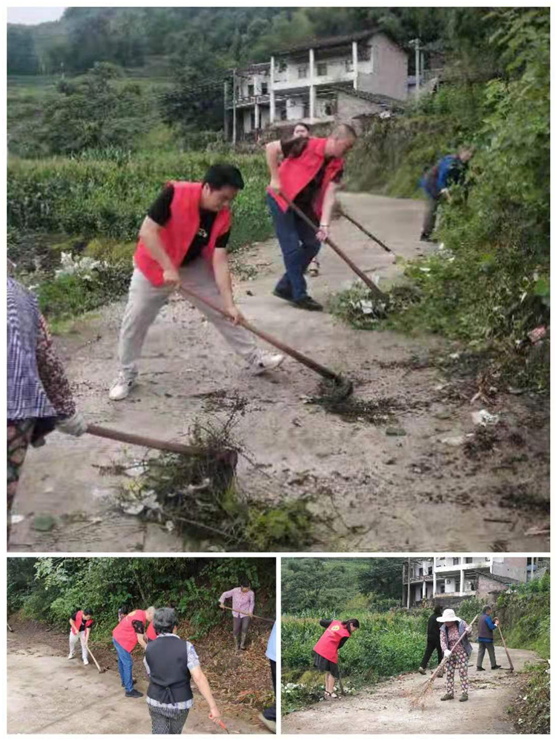 自來水公司工作人員幫助貧困戶對災后道路上淤泥和雜草進行清除,方便出行。
