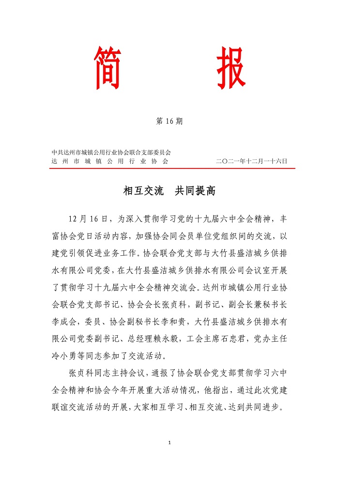 中共達(dá)州市城鎮(zhèn)公用行業(yè)協(xié)會(huì)聯(lián)合支部委員會(huì)2021年第十六期簡報(bào)