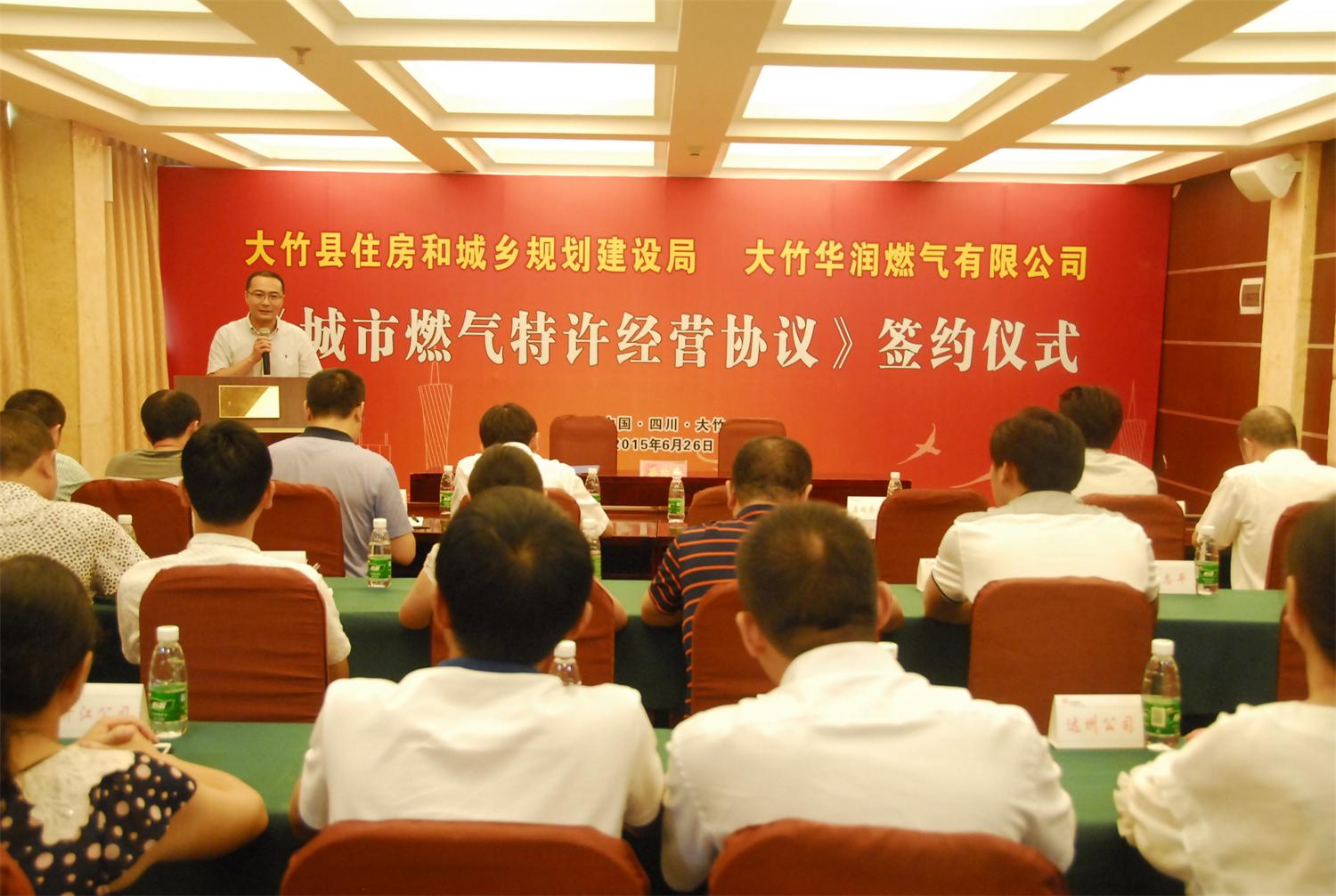 2015年6月26日上午,大竹華潤(rùn)燃?xì)庥邢薰尽冻鞘腥細(xì)馓卦S經(jīng)營(yíng)協(xié)議》簽約儀式在東湖國(guó)際酒店四樓會(huì)議室舉行。中共大竹縣縣委常委、常務(wù)副縣長(zhǎng)李志超,華潤(rùn)燃?xì)馑拇ù髤^(qū)執(zhí)行總經(jīng)理車德臣出席了簽約儀式。簽約儀式由大竹縣人民政府副縣長(zhǎng)何先如主持。