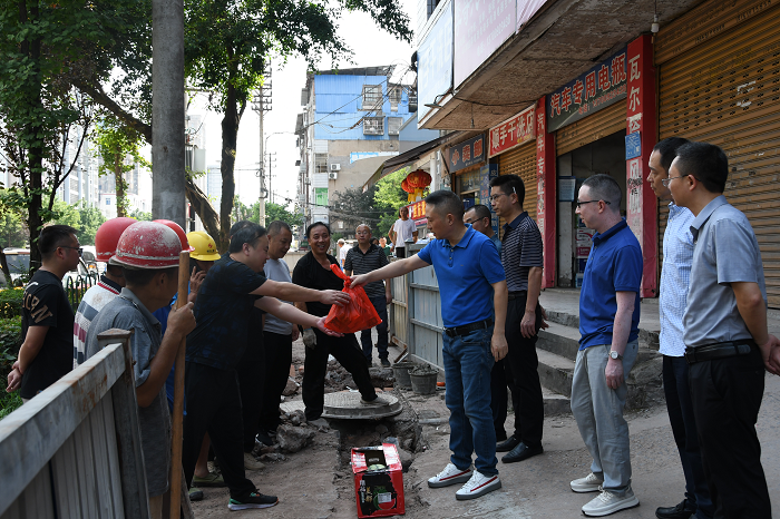 “送清涼”領(lǐng)導(dǎo)關(guān)懷備至 “戰(zhàn)酷暑”員工奮力爭(zhēng)先。炎炎夏日,驕陽(yáng)似火。連日來的持續(xù)高溫天氣給奮戰(zhàn)在一線的盛潔供排水人帶來巨大“烤”驗(yàn)。為了進(jìn)一步鼓舞士氣、增添干勁,近日,盛潔公司黨委書記、董事長(zhǎng)李軒,黨委副書記、總經(jīng)理賴永毅分別帶隊(duì)開展“送清涼”慰問活動(dòng),為在高溫酷暑中辛勤工作的公司一線員工送去西瓜、板藍(lán)根、金銀花、藿香正氣液等夏日消暑慰問品,積極傳遞公司黨、政、工對(duì)員工的親切關(guān)懷。