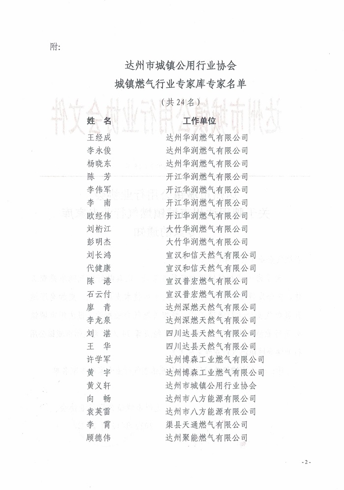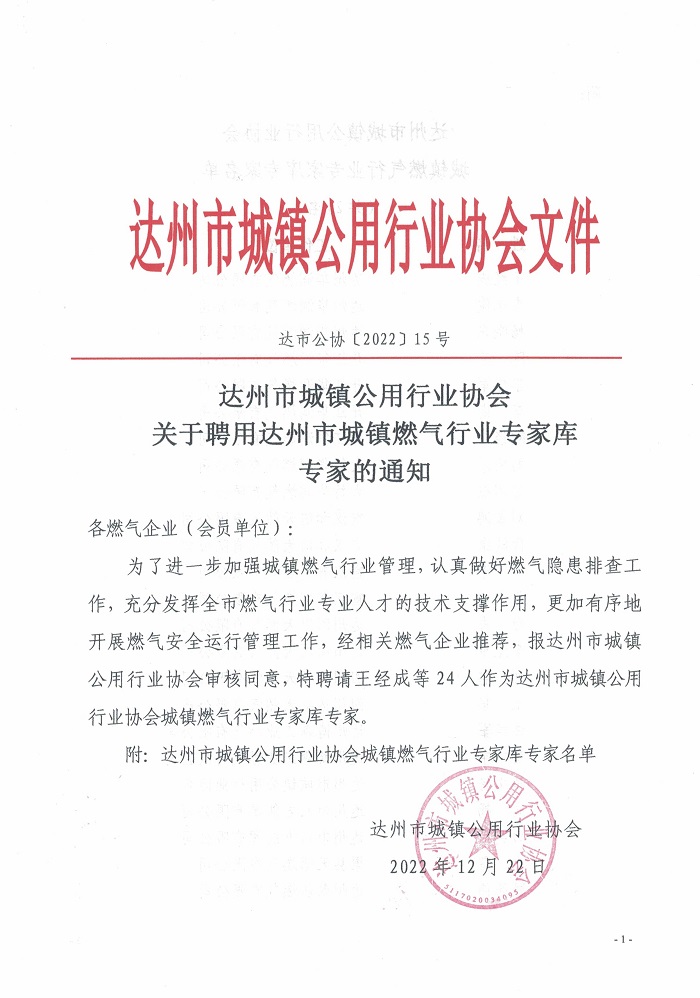 關(guān)于聘用達(dá)州市城鎮(zhèn)燃?xì)庑袠I(yè)專家?guī)鞂<业耐ㄖ?