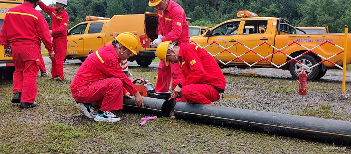 演練模擬了南壩調(diào)壓計(jì)量站后端DN200中壓主干線被第三方施工隊(duì)在施工過(guò)程中損傷,造成天然氣泄漏事故。面對(duì)突發(fā)事故,應(yīng)急隊(duì)伍反應(yīng)迅速,現(xiàn)場(chǎng)搶修組第一時(shí)間趕赴現(xiàn)場(chǎng),及時(shí)關(guān)閉上、下游閥門(mén);救援組立即操控消防車(chē)對(duì)外泄天然氣進(jìn)行了水霧狀控制,防止意外引燃天然氣;隨后技術(shù)組對(duì)環(huán)境檢測(cè)達(dá)標(biāo)后,現(xiàn)場(chǎng)搶修組駕駛集等離子切割、電焊、發(fā)電、挖掘、空壓設(shè)備及抽水等多功能于一體的專(zhuān)用應(yīng)急搶險(xiǎn)車(chē)實(shí)施了搶修作業(yè)。從接警、指揮與協(xié)調(diào)報(bào)告、現(xiàn)場(chǎng)處置,到搶險(xiǎn)完畢、安全恢復(fù)供氣等各環(huán)節(jié)緊張有序進(jìn)行,有效檢驗(yàn)了中壓天然氣管道泄漏應(yīng)急預(yù)案的實(shí)用性、可操作性。
