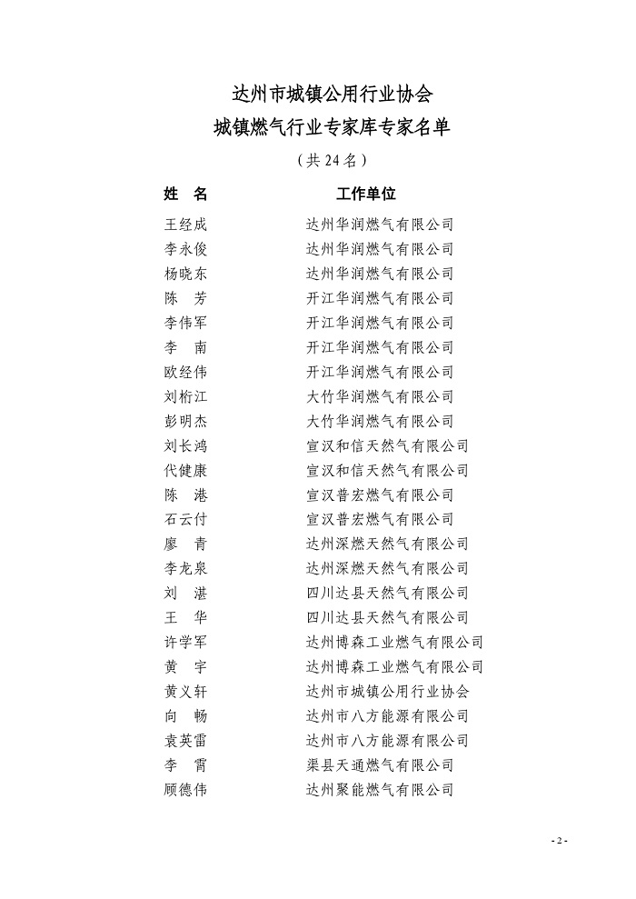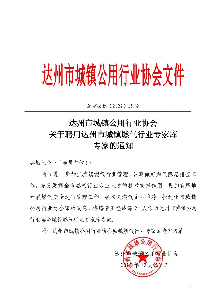 達州市城鎮(zhèn)公用行業(yè)協(xié)會關(guān)于聘用城鎮(zhèn)燃氣專家的通知