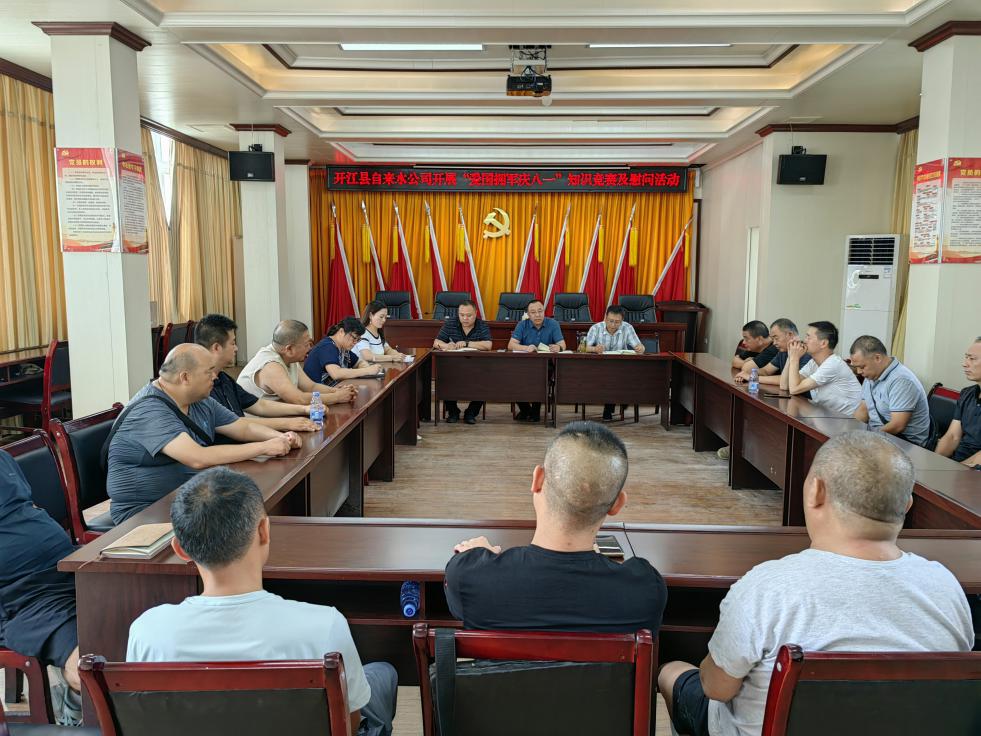 為熱烈慶祝中國人民解放軍建軍96周年,弘揚愛國擁軍光榮傳統(tǒng),進一步增強公司凝聚力。8月1日下午,開江縣自來水公司在四樓會議室召開“愛國擁軍慶八一”知識競賽及慰問活動,公司在家領(lǐng)導(dǎo)班子、退役軍人參加活動。