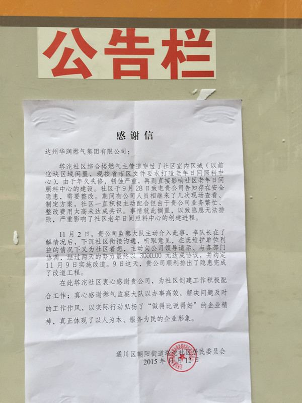 11月12日,達(dá)州市通川區(qū)塔沱社區(qū)居委會一行數(shù)人,來到達(dá)州華潤燃?xì)庥邢薰,“感謝你們及時為社區(qū)消除了安全隱患,我們心里終于踏實(shí)了!鄙鐓^(qū)領(lǐng)導(dǎo)向公司總經(jīng)理何勇表達(dá)謝意,并將一封感謝信張貼在公司的宣傳欄里。