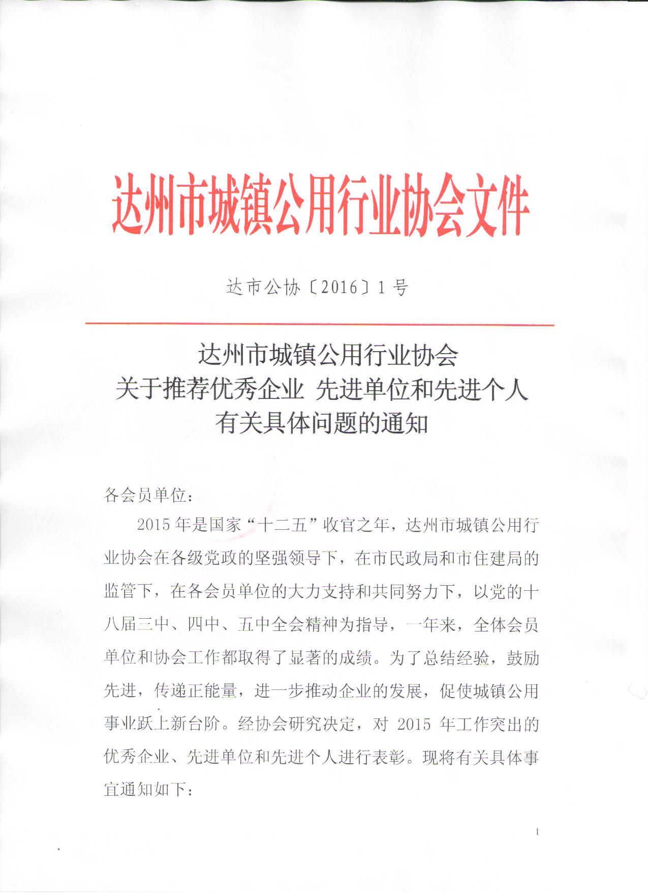 達(dá)州市城鎮(zhèn)公用行業(yè)協(xié)會關(guān)于繳納2016年度會費的通知