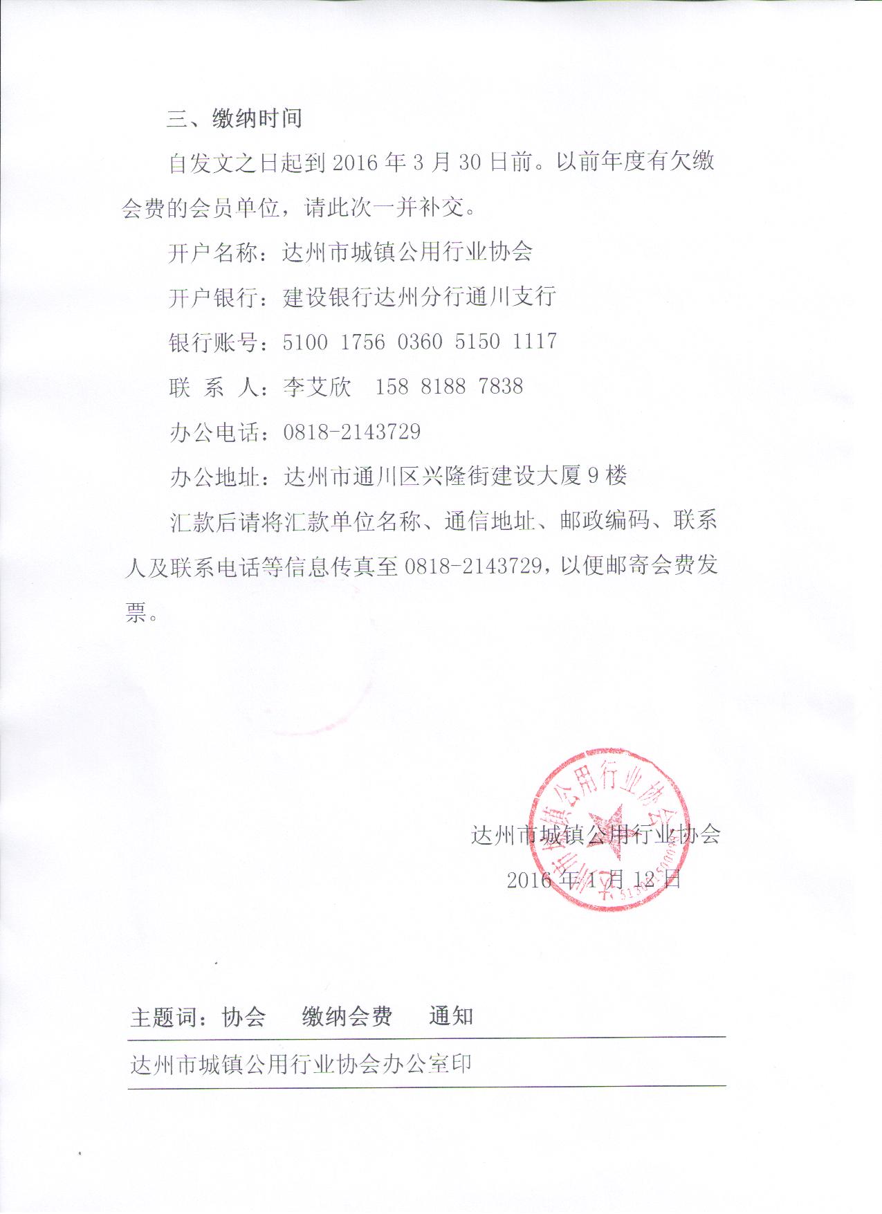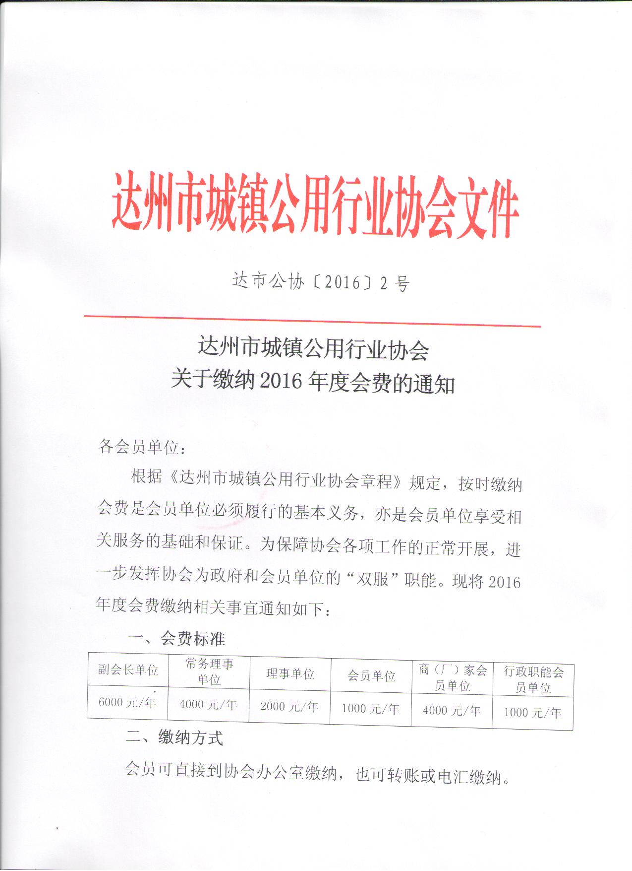 達州市城鎮(zhèn)公用行業(yè)協(xié)會關(guān)于繳納2016年度會費的通知