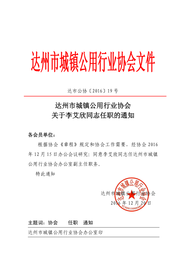 達(dá)州市城鎮(zhèn)公用行業(yè)協(xié)會關(guān)于李艾欣同志任職的通知