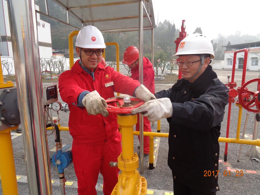 上午11點(diǎn),廟壩站放散點(diǎn)置換工作準(zhǔn)備就緒,福成寨站內(nèi)來(lái)自大竹作業(yè)區(qū)計(jì)量班和調(diào)壓班的10名專家也共同完成了通氣前的最后一次檢查、調(diào)試工作。隨后,大竹作業(yè)區(qū)副總汪陽(yáng)和大竹華潤(rùn)燃?xì)庥邢薰靖笨偫讓W(xué)建共同擰開(kāi)了燃?xì)忾y門,伴隨著“嗤、嗤”的氣流聲,置換工作準(zhǔn)時(shí)開(kāi)始。12點(diǎn)38分,從廟壩監(jiān)控點(diǎn)傳來(lái)消息,檢測(cè)儀顯示的數(shù)據(jù)已達(dá)到置換方案的要求,置換合格,本次天然氣置換工作順利完成。