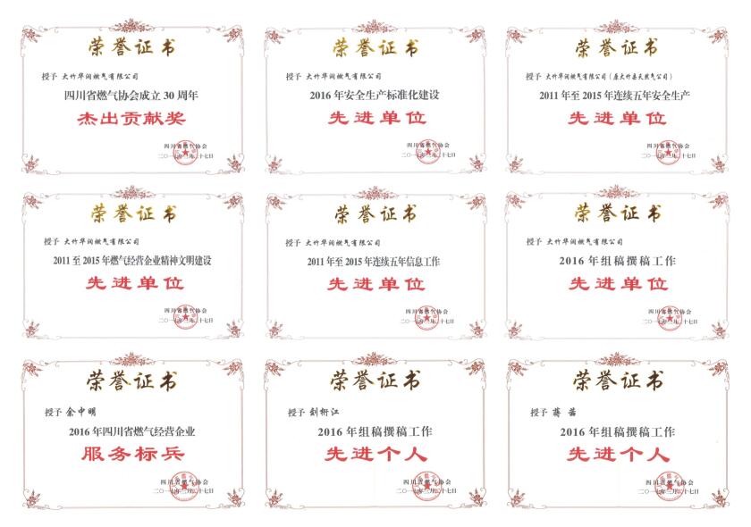 一、喜獲四川省燃?xì)鈪f(xié)會(huì)9項(xiàng)榮譽(yù)表彰