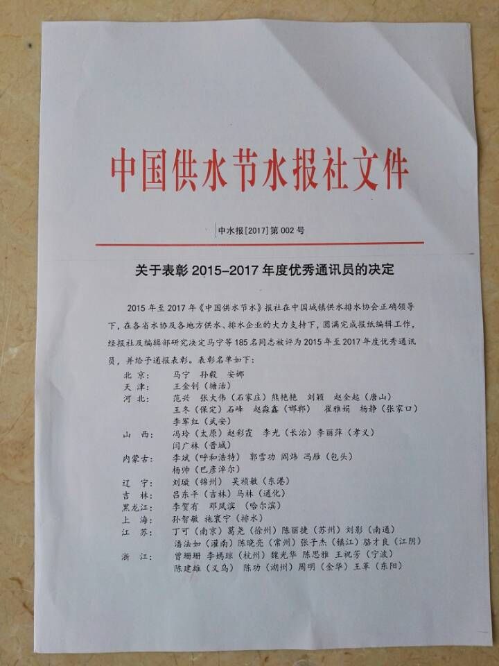 泓霖供水公司信息工作獲表彰。近日,從在山東泰安召開的中國供水節(jié)水報社信息工作會議上傳來喜訊,大竹泓霖供水公司兩名員工唐毅、常向波被表彰為2015-2017年度優(yōu)秀通訊員。