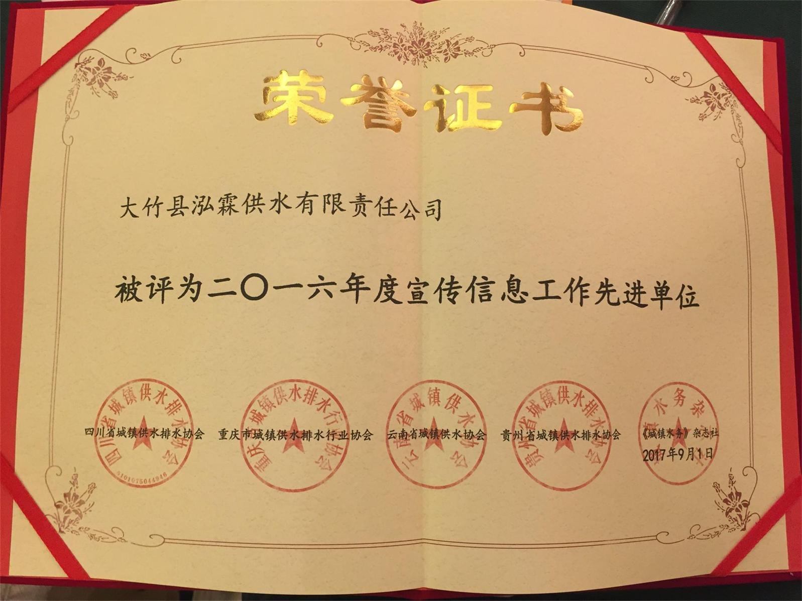 泓霖供水公司宣傳信息工作再傳捷報。繼8月份公司兩名通訊員被《中國供水節(jié)水》報社表彰為“2015-2017年度優(yōu)秀通訊員”后,近日,公司宣傳信息工作再傳捷報,公司被四川省城鎮(zhèn)供水排水協(xié)會、重慶市城鎮(zhèn)供水排水協(xié)會、云南省城鎮(zhèn)供水協(xié)會、貴州省城鎮(zhèn)供水排水協(xié)會、《城鎮(zhèn)水務(wù)》雜志社聯(lián)合表彰為“2016年度宣傳信息工作先進單位”。這是自2016年三省一市供排水協(xié)會及《城鎮(zhèn)水務(wù)》雜志首次聯(lián)合表彰宣傳信息工作先進單位以來公司第二次獲此殊榮。