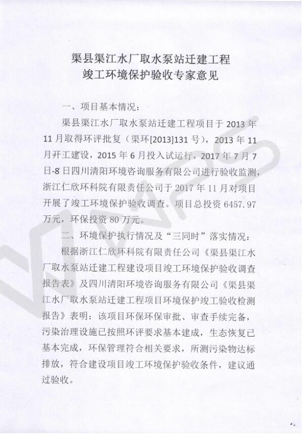 2017年12月18日,渠縣供水排水總公司組織環(huán)評(píng)單位(成都市環(huán)境保護(hù)科學(xué)研究院)、設(shè)計(jì)單位(渠縣供排水總公司)、施工單位(渠縣供排水總公司)、驗(yàn)收調(diào)查單位(浙江仁欣環(huán)科院有限責(zé)任公司)及渠縣環(huán)境監(jiān)測(cè)站3名專(zhuān)家(名單附后)組成驗(yàn)收組對(duì)渠縣渠江水廠(chǎng)取水泵站遷建工程建設(shè)項(xiàng)目竣工環(huán)境保護(hù)情況進(jìn)行了現(xiàn)場(chǎng)核查驗(yàn)收。驗(yàn)收組對(duì)建設(shè)項(xiàng)目現(xiàn)場(chǎng)進(jìn)行了認(rèn)真核查,聽(tīng)取了建設(shè)單位對(duì)工程環(huán)境保護(hù)落實(shí)情況的匯報(bào)及“三同時(shí)”執(zhí)行情況的匯報(bào),結(jié)合驗(yàn)收調(diào)查報(bào)告,經(jīng)認(rèn)真討論形成以下意見(jiàn):