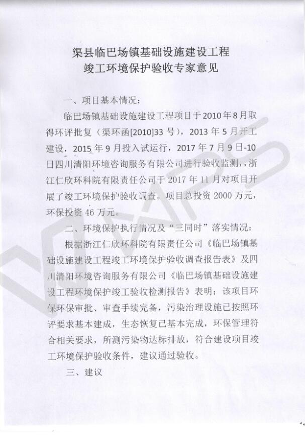 2017年12月18日,渠縣供水排水總公司組織環(huán)評(píng)單位(成都市環(huán)境保護(hù)科學(xué)研究院)、設(shè)計(jì)單位(渠縣供排水總公司)、施工單位(渠縣供排水總公司)、驗(yàn)收調(diào)查單位(浙江仁欣環(huán)科院有限責(zé)任公司)及渠縣環(huán)境監(jiān)測(cè)站3名專(zhuān)家(名單附后)組成驗(yàn)收組對(duì)渠縣臨巴場(chǎng)鎮(zhèn)基礎(chǔ)設(shè)施建設(shè)工程竣工環(huán)境保護(hù)情況進(jìn)行了現(xiàn)場(chǎng)核查驗(yàn)收。驗(yàn)收組對(duì)建設(shè)項(xiàng)目現(xiàn)場(chǎng)進(jìn)行了認(rèn)真核查,聽(tīng)取了建設(shè)單位對(duì)工程環(huán)境保護(hù)落實(shí)情況的匯報(bào)及“三同時(shí)”執(zhí)行情況的匯報(bào),結(jié)合驗(yàn)收調(diào)查報(bào)告,經(jīng)認(rèn)真討論形成以下意見(jiàn):