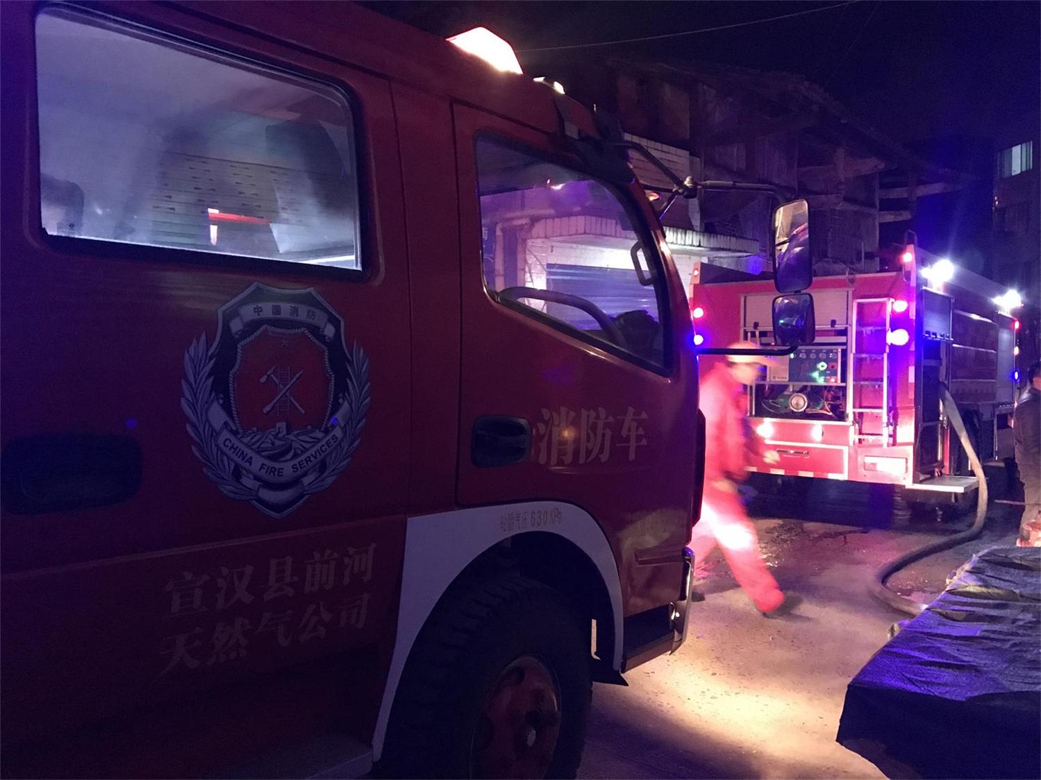 南壩鎮(zhèn)消防中隊(duì)接到報(bào)警后立即趕赴現(xiàn)場(chǎng)救援。由于起火民房屬木質(zhì)結(jié)構(gòu),大火迅速蔓延。南壩鎮(zhèn)消防中隊(duì)請(qǐng)求宣漢縣前河天然氣有限公司派遣消防車及人員趕往現(xiàn)場(chǎng)增援。前河天然氣有限公司接到請(qǐng)求后,火情就是命令,從公司總經(jīng)理到消防員,一刻也不敢耽擱,立即啟動(dòng)消防搶險(xiǎn)應(yīng)急預(yù)案,并在總經(jīng)理鄭玄同志的帶領(lǐng)下,組織消防車及義務(wù)消防隊(duì)員趕赴火場(chǎng),迅速加入滅火施救工作中。經(jīng)過(guò)1個(gè)多小時(shí)的激烈救援,終于在4點(diǎn)許將火勢(shì)控制,避免了更大的災(zāi)情發(fā)生。
