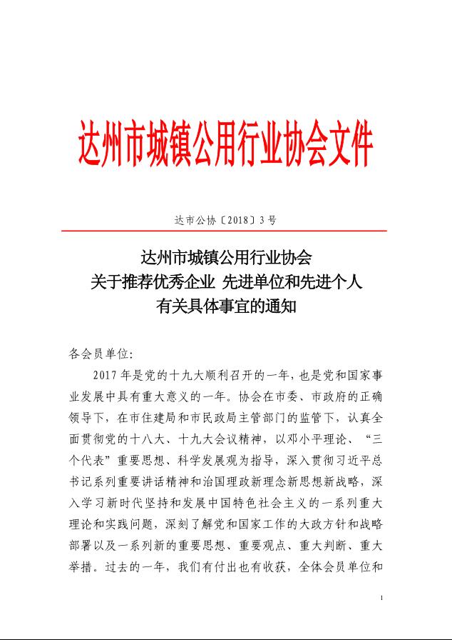 達(dá)州市城鎮(zhèn)公用行業(yè)協(xié)會關(guān)于繳納2018年度會費(fèi)的通知