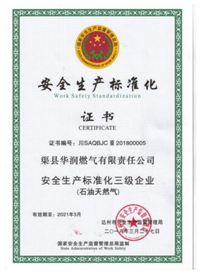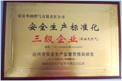 近日,渠縣華潤燃氣有限責任公司被達州市安全生產(chǎn)監(jiān)督管理局授予“安全生產(chǎn)標準化三級企業(yè)(石油天然氣)”獎牌和證書。