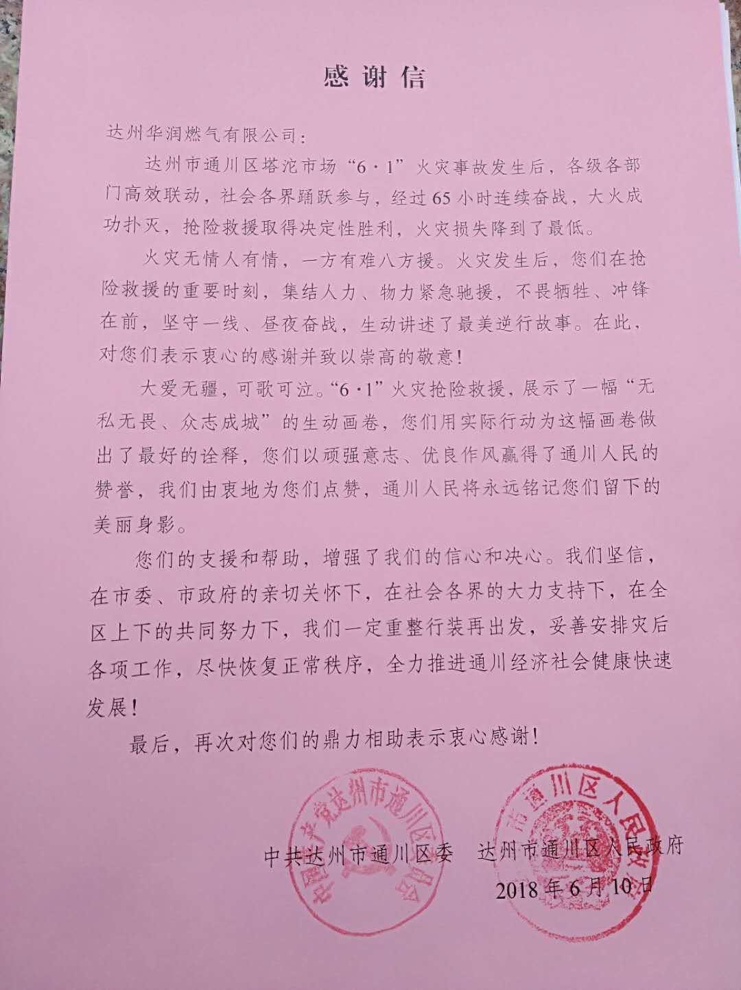 6月10日下午,達(dá)州市通川區(qū)委區(qū)政府專程派人到達(dá)州華潤(rùn)燃?xì)庥邢薰荆蚬径麻L(zhǎng)梁浩、黨委書記、總經(jīng)理何勇送上了一封主題為“火災(zāi)無(wú)情人有情,一方有難八方援”的感謝信,誠(chéng)摯感謝公司在通川區(qū)塔沱市場(chǎng)“6·1”火災(zāi)救援行動(dòng)中高效聯(lián)動(dòng)、踴躍參與作出的突出貢獻(xiàn)。
