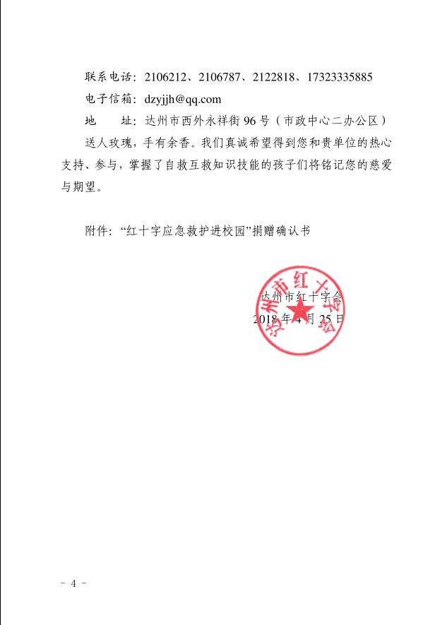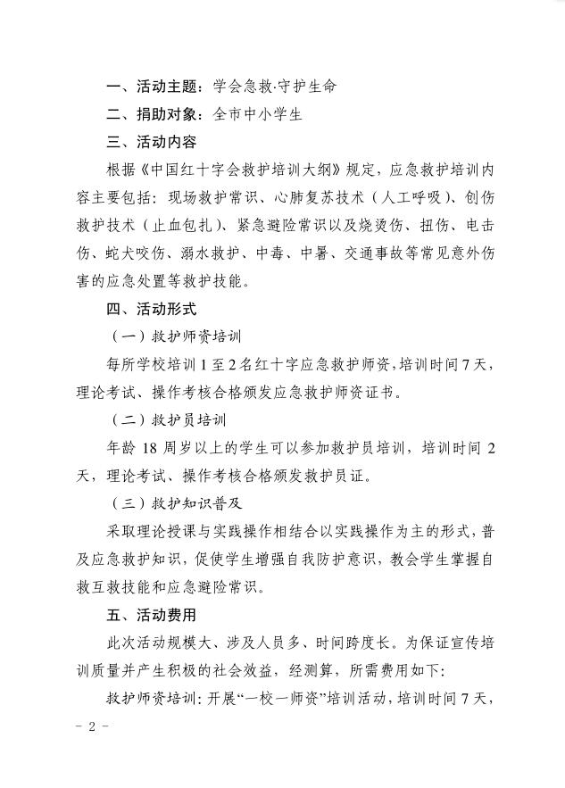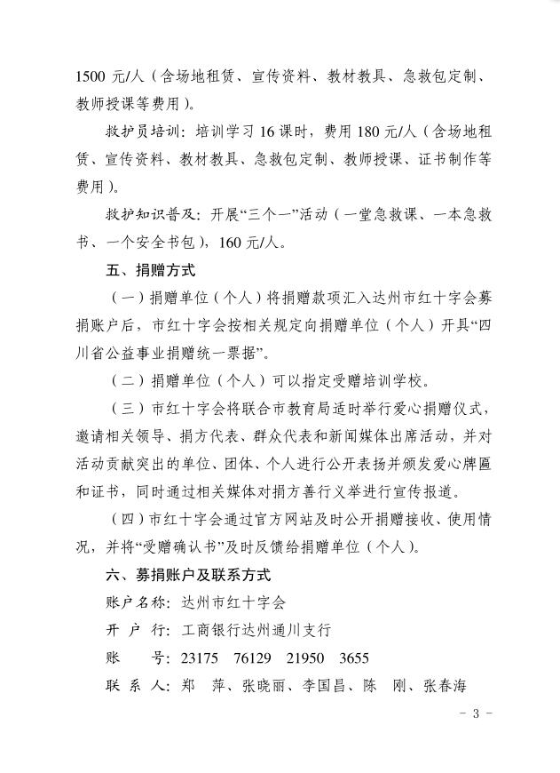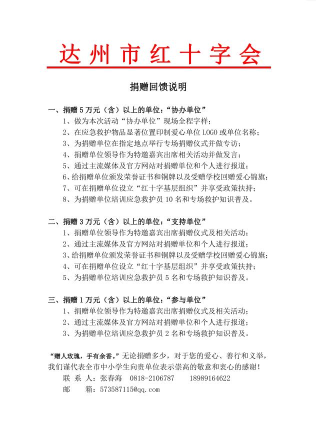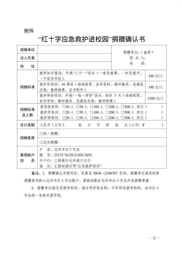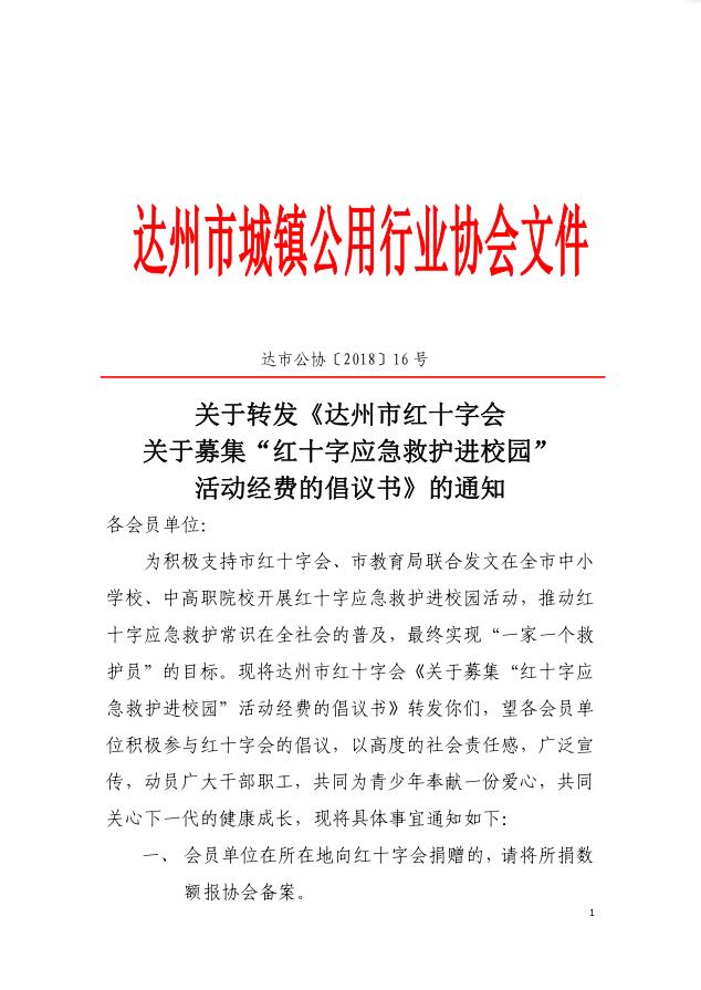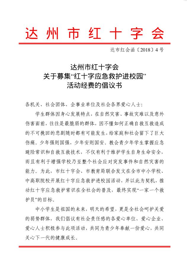 關(guān)于轉(zhuǎn)發(fā)《達(dá)州市紅十字會(huì)關(guān)于募集“紅十字應(yīng)急救護(hù)進(jìn)校園”活動(dòng)經(jīng)費(fèi)的倡議書(shū)》的通知