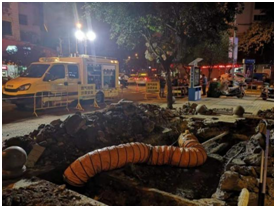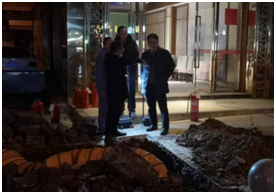 時間回放到12月4日上午8點40分,公司接到用戶報警,“洞天大酒店門口異味嚴重,疑似天然氣泄漏”。警情就是命令,搶險人員立即趕赴現(xiàn)場確認險情。通過初步查勘,現(xiàn)場無施工痕跡,周邊窨井可燃氣體濃度已達到爆炸極限,情況十分危急。公司接到現(xiàn)場反饋后,立即啟動搶險應(yīng)急預案,迅速增派人員趕到燃氣泄漏區(qū)域,10余名搶修人員各司其責,疏散區(qū)域人員、建立警戒區(qū)域、布置警戒力量和消防設(shè)備、打探測孔、查找泄漏點、監(jiān)測周邊濃度、確定燃氣漏點、開啟鼓風置換裝備、實施開挖等工作有條不紊地同步進行。因漏氣現(xiàn)場各種管線(水、電、氣、通訊等)錯綜復雜,掩埋介質(zhì)都為混凝土,周邊窨井、下水道濃度在爆炸極限內(nèi),無法機械破碎開挖。